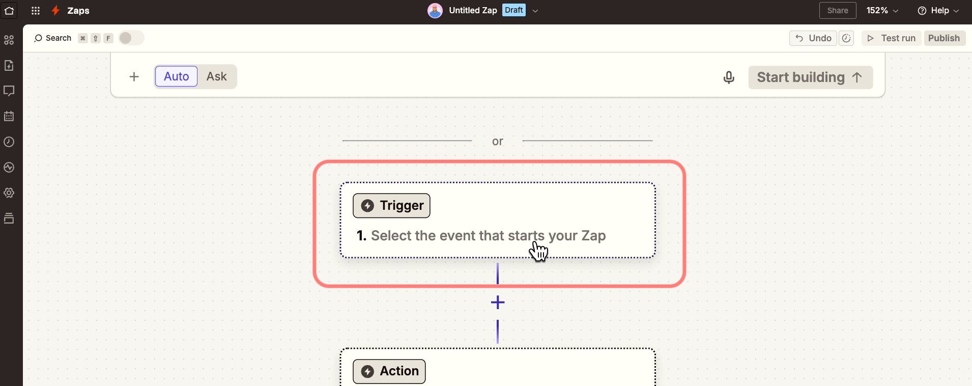 Every Zap needs to start with a trigger. That’s the event that prompts the automation to run. Click on “Trigger” to add one to your Zap.
