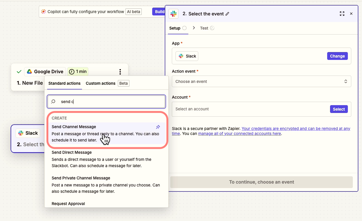 For this Slack message step, you just need to pick a channel to send the message to, and you need to compose the message. We’d recommend sending to a dedicated test channel while you’re building.