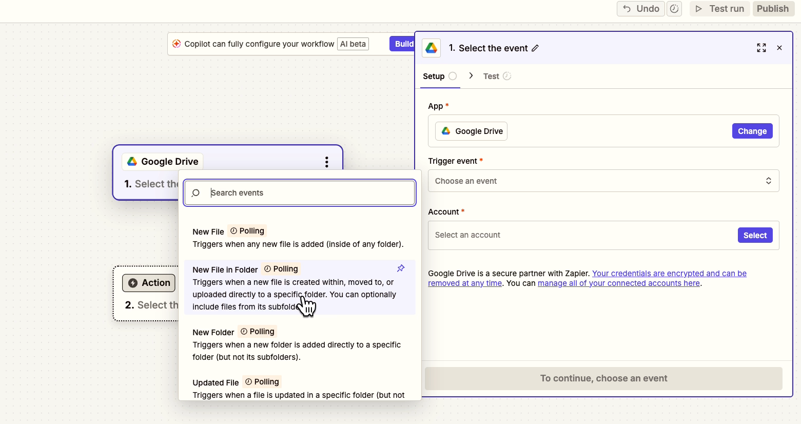 Then, select the specific event your Zap should trigger on – in this case, that’s “New file in Folder”.
