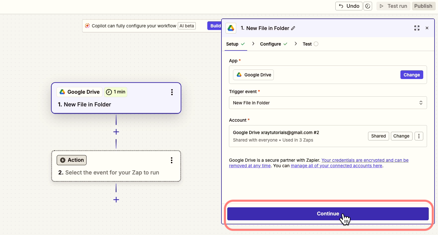 Note that for nearly every app that you use in Zapier, you’ll need to connect your own account. When you add a new account, Zapier will walk you through the instructions. In most cases, like with Google Drive, you’ll just need to sign in to your account and allow Zapier the access it requests.