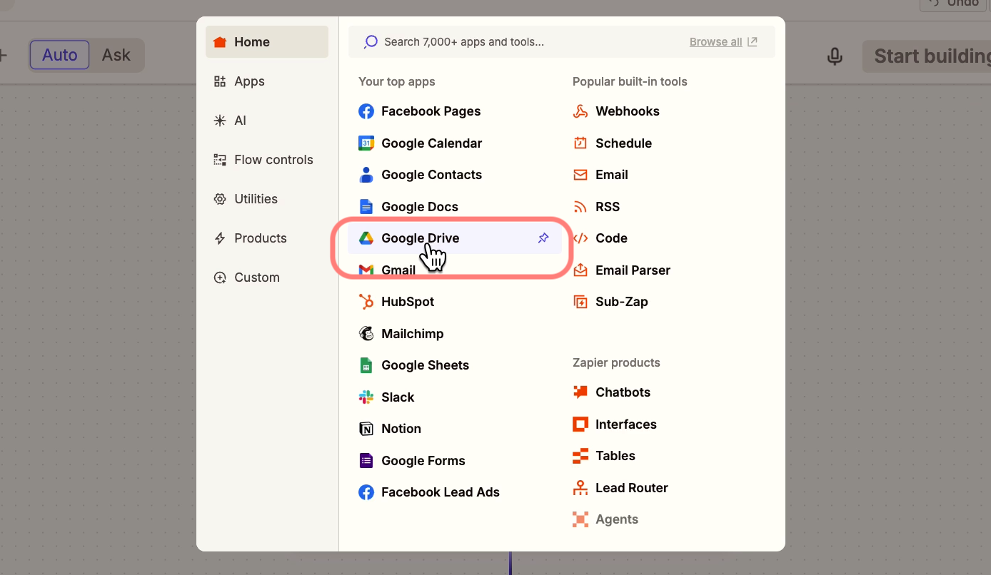 Then, choose the app where your trigger event will occur. For our example, that will be in Google Drive.