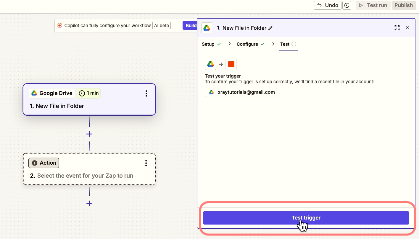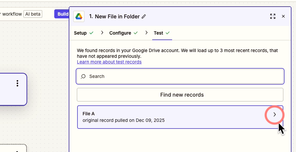 Once you’ve finished configuration, give your trigger a test. It should find the test data you made earlier, as well as any other files you’ve uploaded to your specified folder.