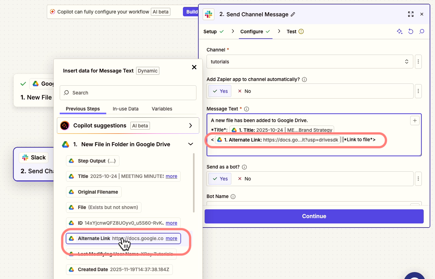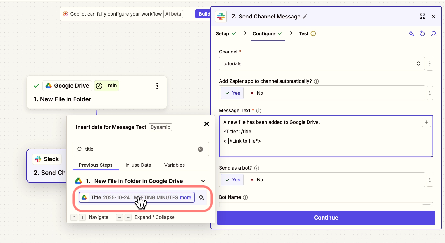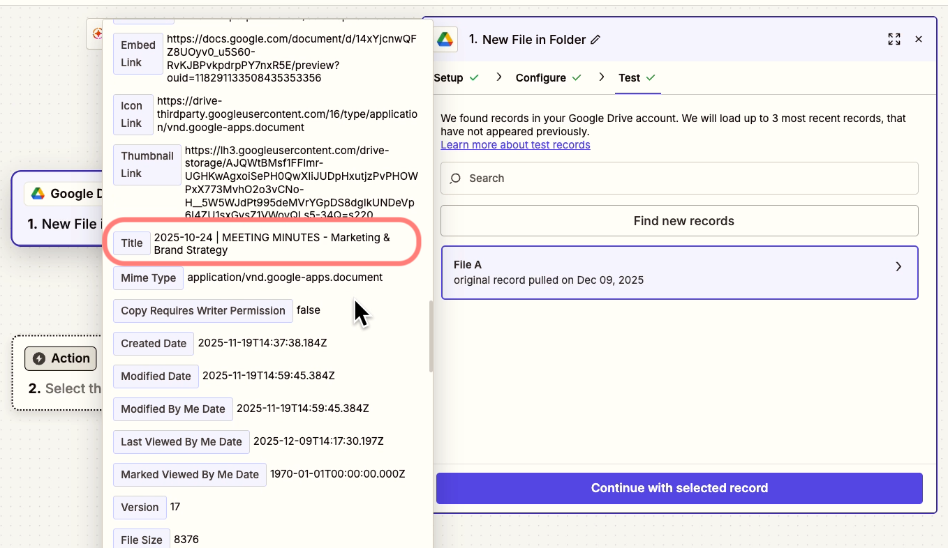 For instance, when we reference the “Title” variable anywhere in future steps in the Zap, it will fill in the title of the Google Doc that it’s processing - not just this specific Doc that we’re testing with now.