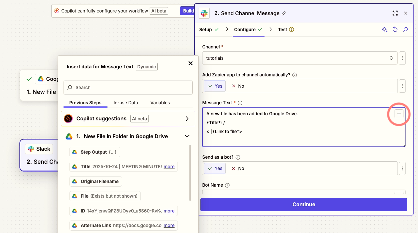 In a Slack message, and in virtually any text field in Zapier, you can insert variables from earlier steps by clicking on the plus button, or by pressing forward slash (/).