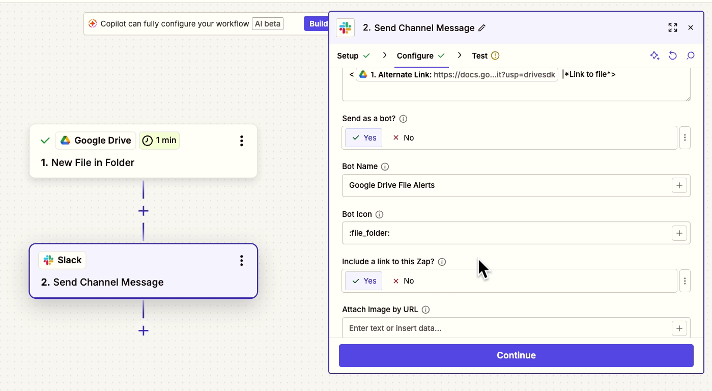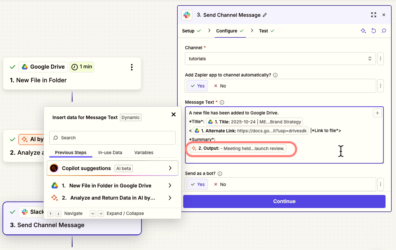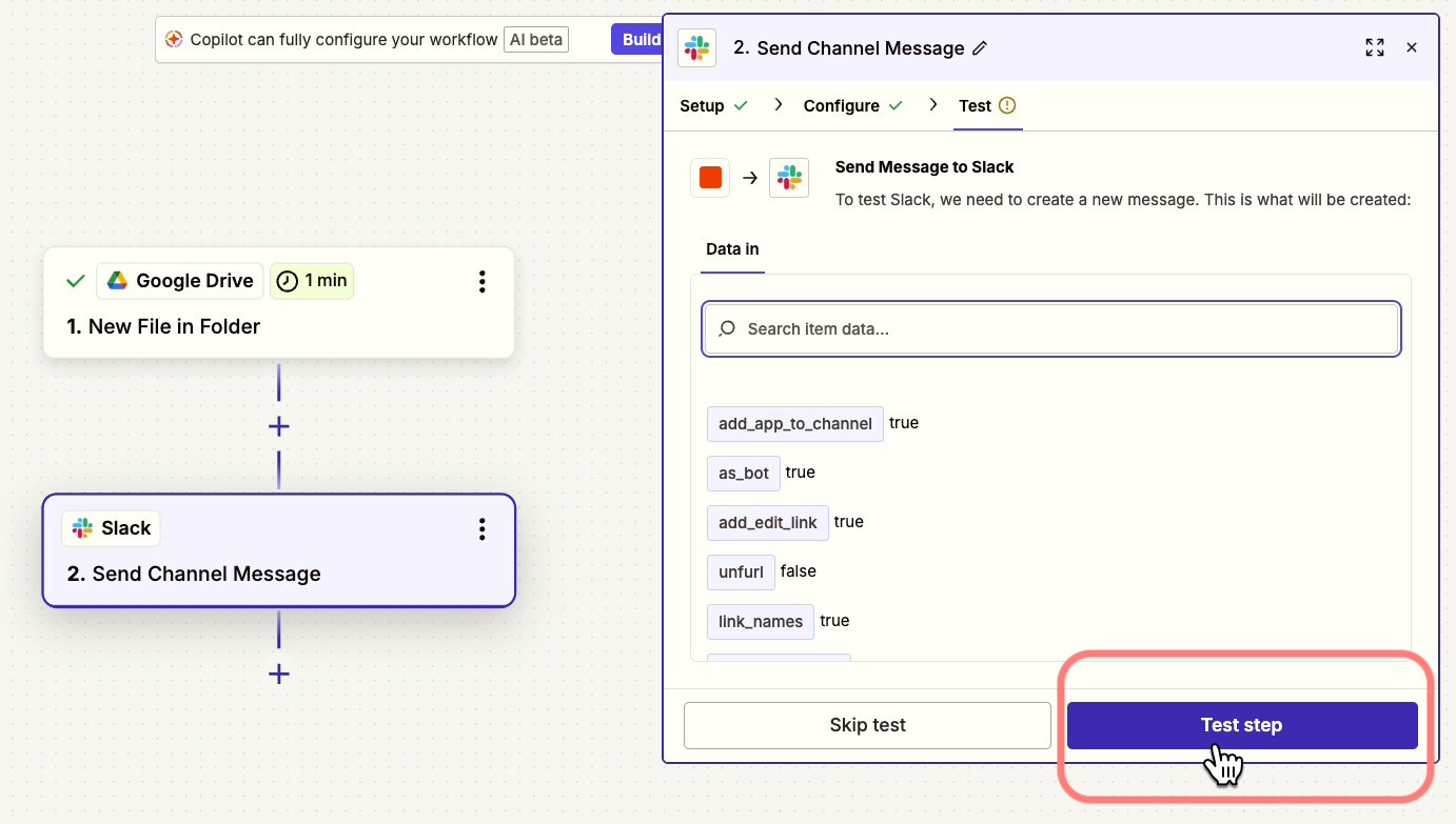 Then, give your Slack step another test. You should see that the new message includes the AI summary as well.