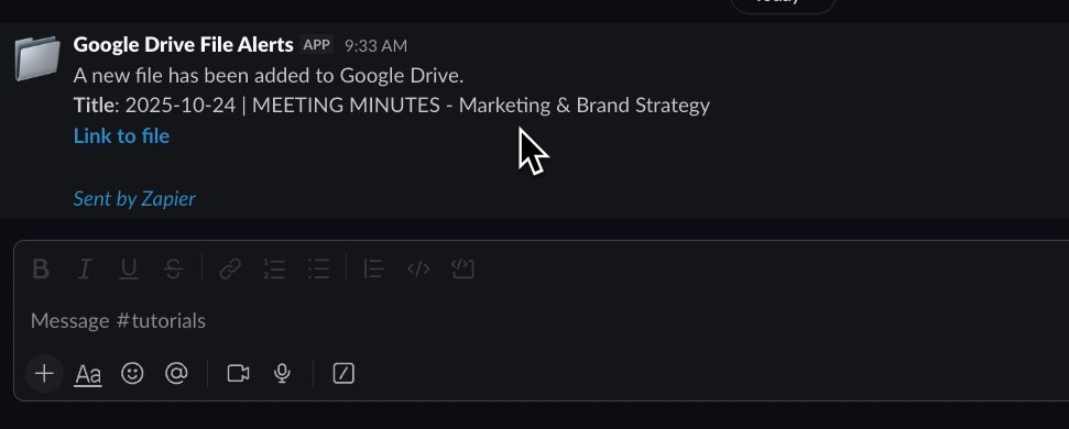 Below, you can see the Slack message sent by our automation, complete with an actual title and link filled in.