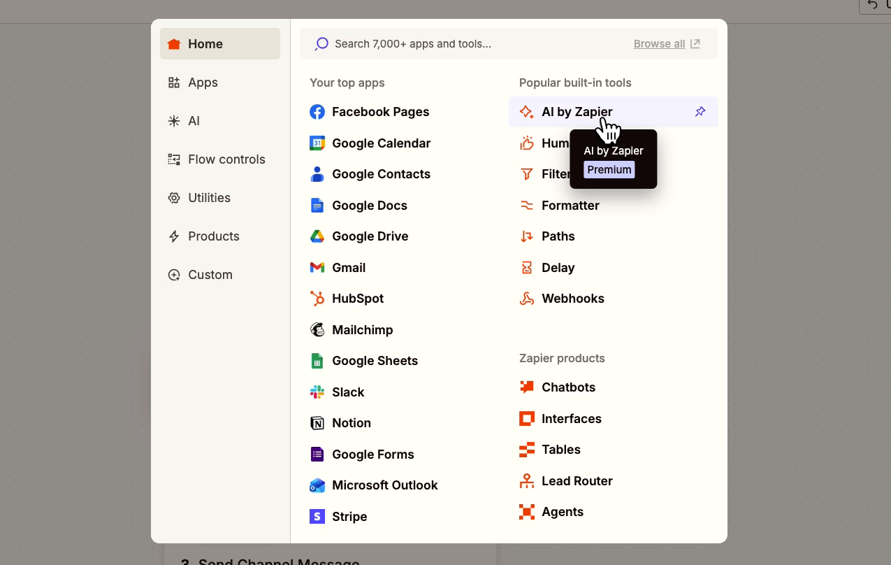 Go back and add an action after the trigger, and select “AI by Zapier” as the app.