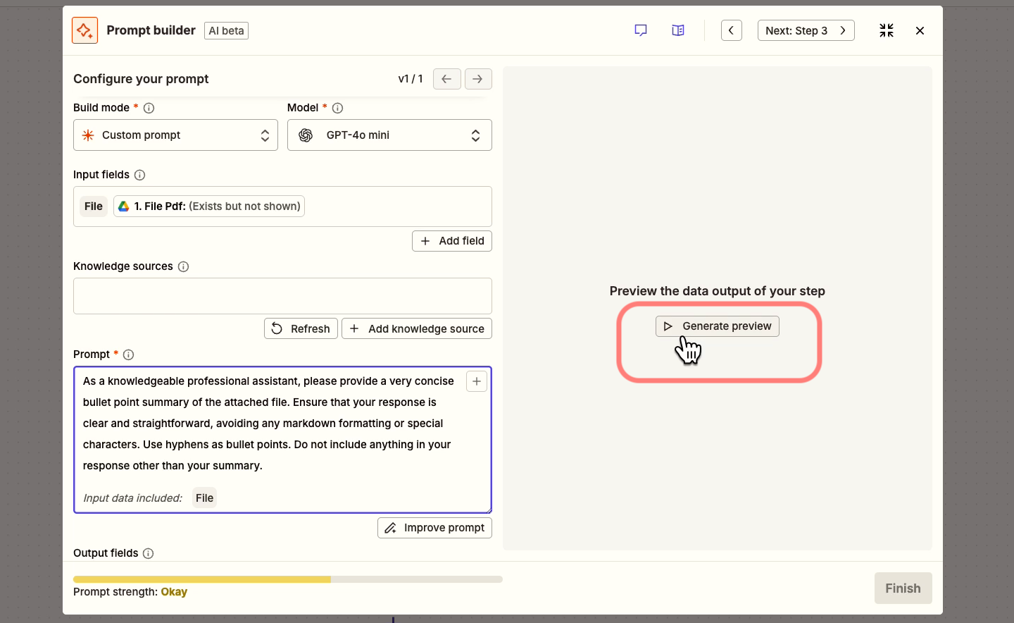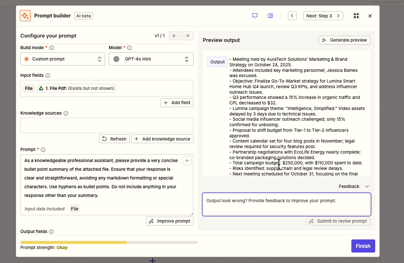 Then, write a simple prompt asking for a brief summary of the attached doc. You can find our example prompt below.