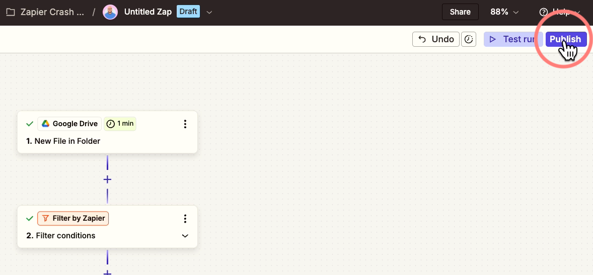 Note that if you’re on a free plan, you won’t be able to publish a multi-step Zap like this.