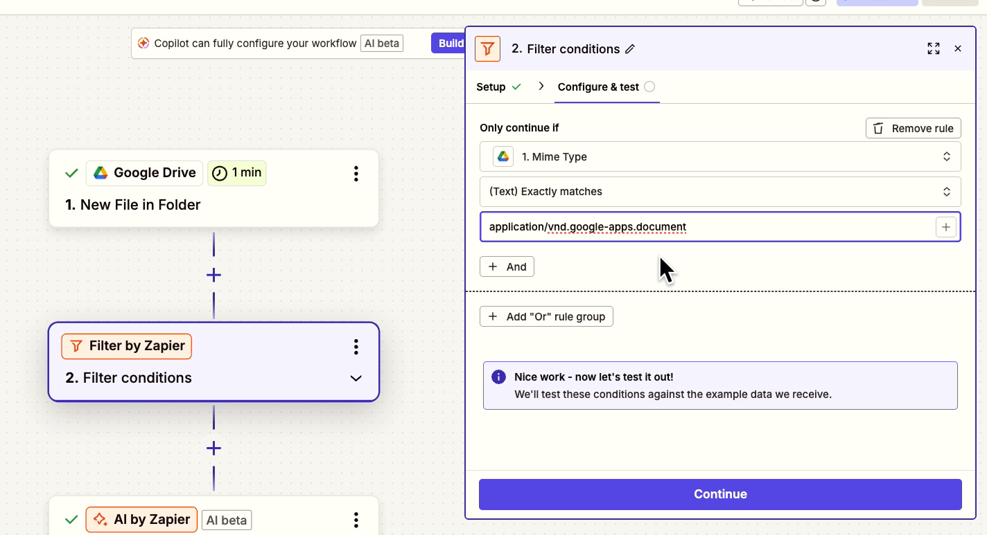 When you test the filter with a Google Doc selected in the trigger, your data will pass the filter, and the automation will continue.