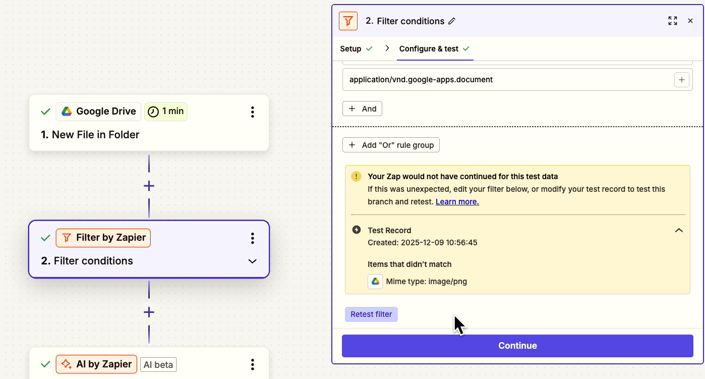 When you test the filter again, Zapier says it wouldn’t proceed, because it’s not the right file type. The automation would stop without running the AI or Slack steps.