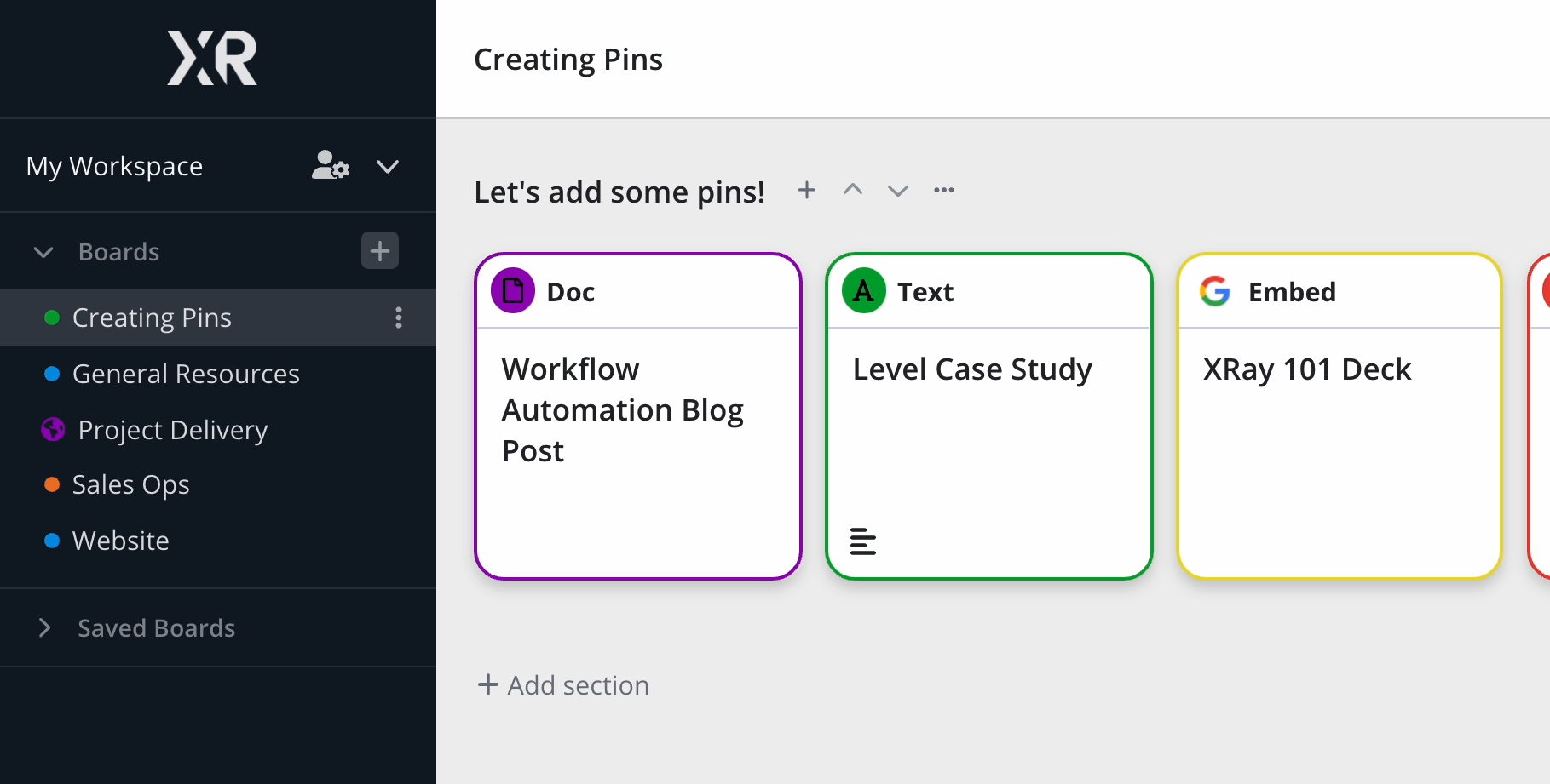 Then, click on the + symbol in any section to create a new pin. In our example, we’ll add a new pin in the “Webhook Demo” section of our board.